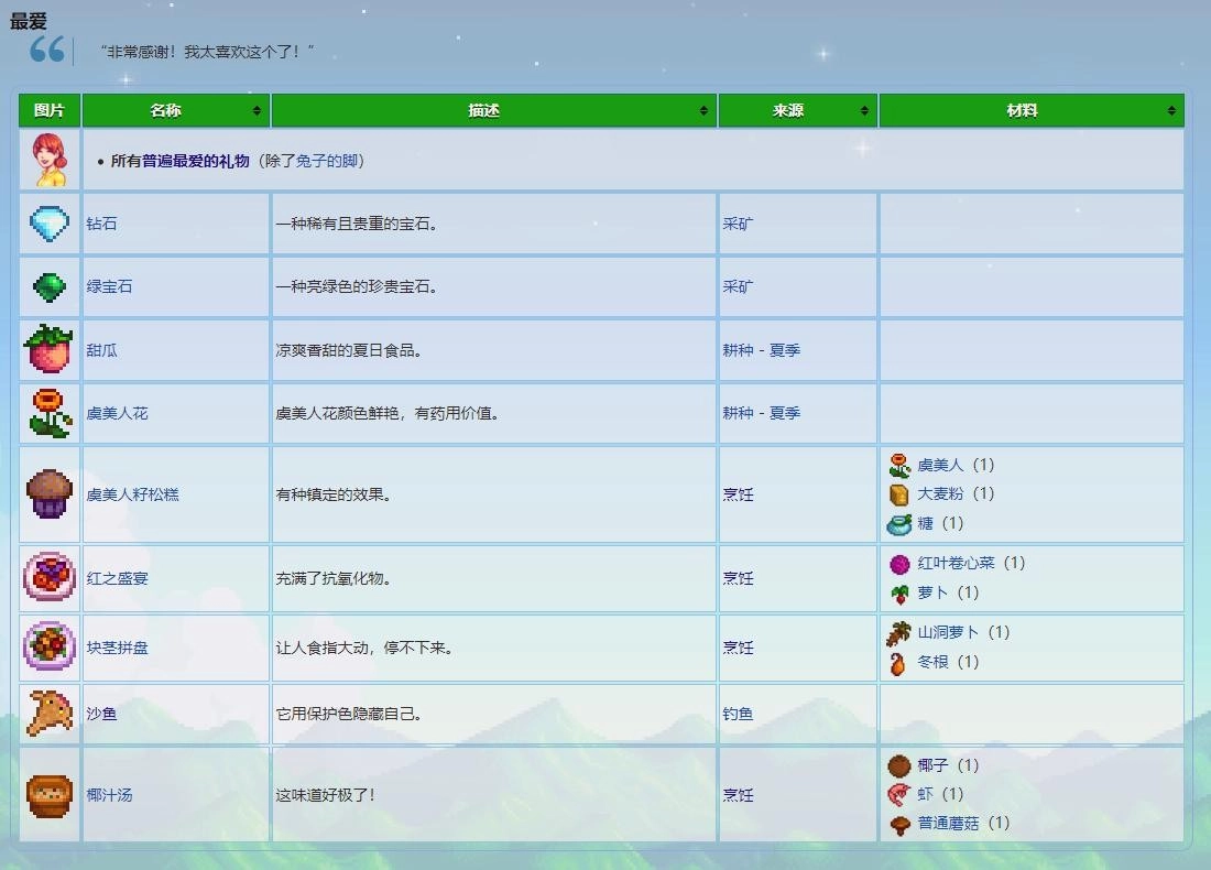 一、最钟爱的礼物:钻石、绿宝石、甜瓜、虞美人花、虞美人籽松糕、红之盛宴、块茎拼盘、沙鱼、椰汁汤、五彩碎片、珍珠、黄金南瓜、魔法糖冰棍。