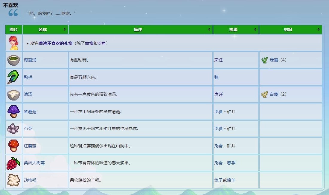 四、不受青睐的礼物:海藻汤、鸭毛、清汤、紫蘑菇、石英、红蘑菇、美洲大树莓、动物毛,以及NPC通常都不喜欢的礼物。