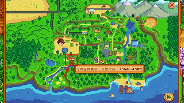 3、接下来,需要在地图上找到玛尔妮农场。其位置在自家农场右下侧稍偏一点的地方。
