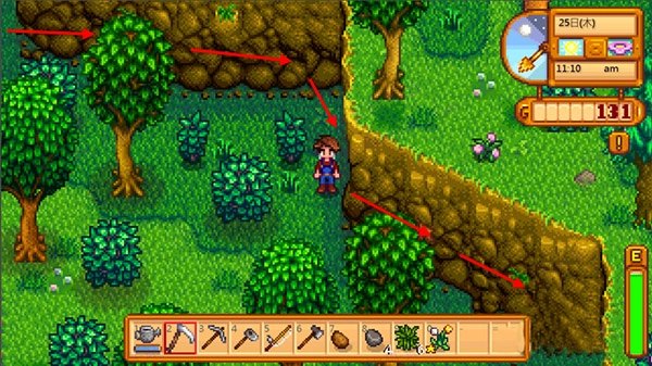 16、温泉大致于夏季前中期开放。具体情形是,主角刚睡醒走出屋子,便会收到提示,听到火车呼啸而过的声音。温泉具有帮助主角消除疲劳的功效,从0补充至270,大约仅需游戏时间一小时。需注意,在温泉中不可移动,否则无法补充体力。