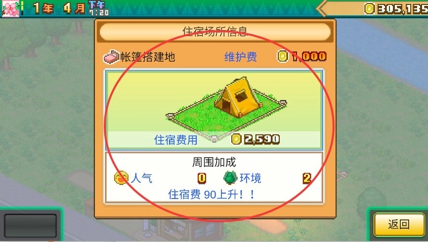 3、当选中已搭建好的帐篷区域时,会弹出详细的数据面板,该面板涵盖租金收入、日常维护支出等经营要素。