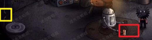 走到红框的位置滴上几滴樱桃汁,等左边的扫地机器人移动过来,就抓紧时间用剪刀把黄框那里的线剪断,之后再回到红框处多次倾倒樱桃汁。当机器人电量不足返回左侧充电时,打开机器人的外壳,取出里面的零件。