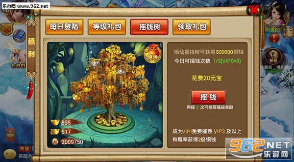 《仙剑诛魔》里设置了摇钱树功能,每日有一次免费摇钱机会,能得到500000铜钱。另外在【奖励】板块中,除了摇钱树,在线奖励的大转盘每天可以抽取三次,其中也能抽到铜币卡。