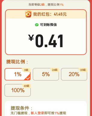 红包提现比例初始为百分之一,需达到24级才能提升至5%。