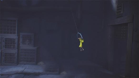 按照图中标注的位置,把小铁笼拖到此处,然后跳上拉索晃动,借助摇晃的力量让自己顺势进入门内就可以了。