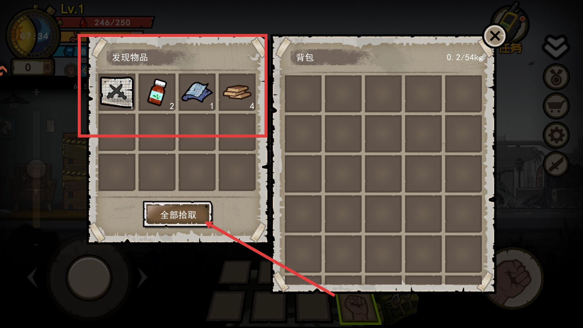 在探索过程中找到物资后,点击【全部拾取】按钮,即可获取【地图】、【药水】、【木板】等物品,为后续的生存积累必要资源。