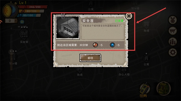 准备前往【安全屋】,需要消耗【5】点饱食度和【5】点水分,花费【30分钟】的时间抵达该区域进行避险。