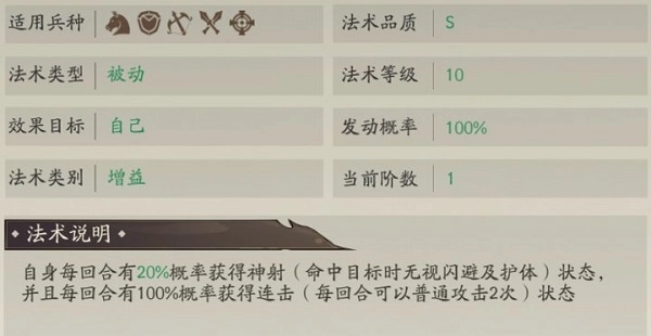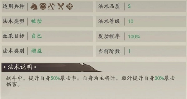 固有被动法术“南天冰魄”能为自身带来可观的暴击率与暴击伤害加成。兵符进阶后的质子旅,可在战斗前三回合提升全军暴击率,使暴击触发更为稳定。其余两个法术可选择“劈波斩浪”与“电闪雷鸣”——这两个高额物理伤害的法术,能够瞬间爆发大量伤害。