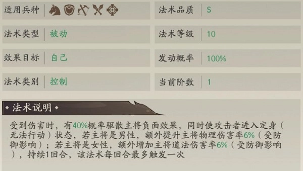作为团队里的全能辅助,其自带的被动技能“九曲葬花”不仅能增强主将的物理输出,还能让主将免疫负面效果,同时对敌方施加控制,以此确保队伍能持续稳定地打出伤害。搭配主动技能“纵横捭阖”,该辅助在提升自身防御的同时,还能替友军承受攻击,既保证了双输出核心的状态稳定,又能让“九曲葬花”的效果持续触发。剩余的技能栏则建议携带“岿然不动”,它能在战斗前两回合给敌方全体挂上畏怯(无法普攻)的debuff,第三回合还会为兵力最少的友军单体回血,进一步优化输出环境。