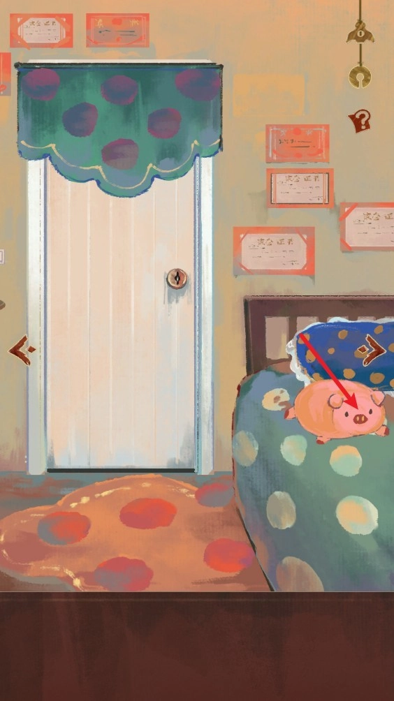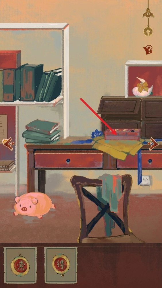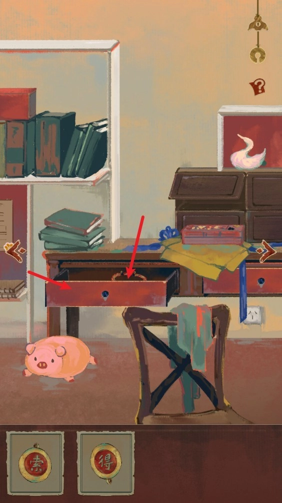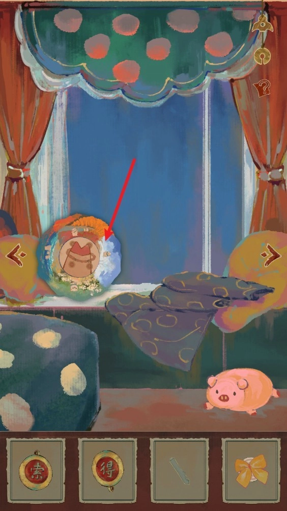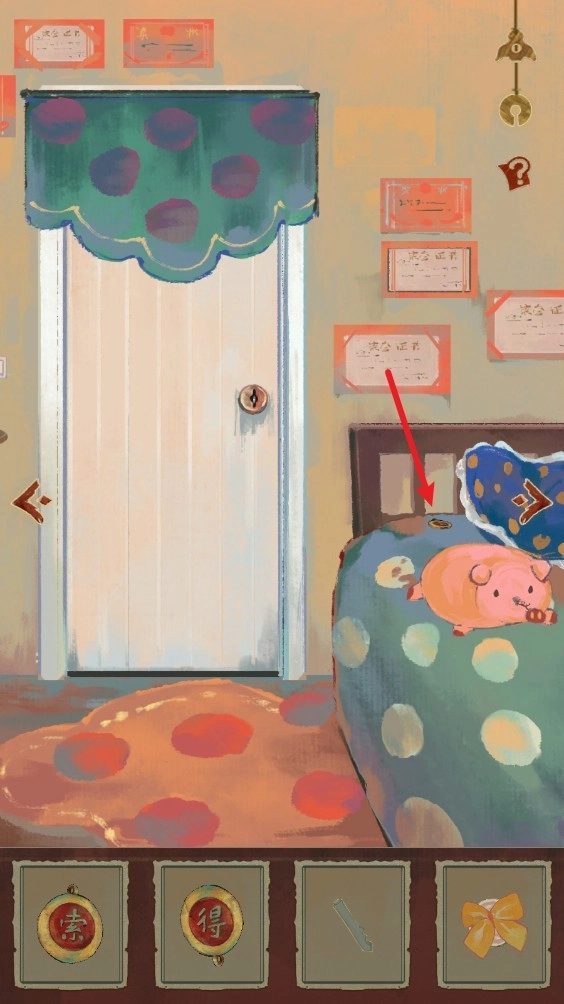 首先进行物品收集,猪鼻子处要“索”,从柜子里拿到“得”,在枕头下面获取“男”。