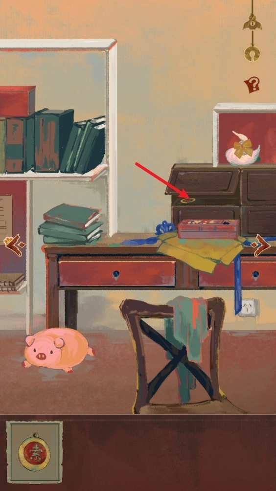 进入图中的房间后,点击箭头所指的位置,接着把手链放置在此处,就会出现若干拼图。