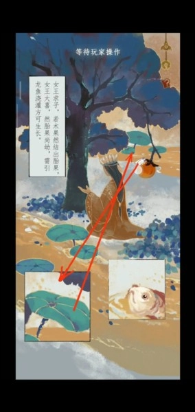 按照提示操作:先把胎果上的玉婵拖到荷叶上,接着用荷叶上的水来浇灌胎果。