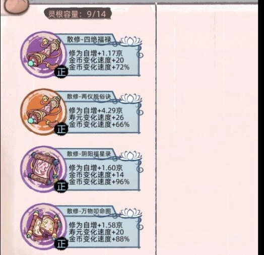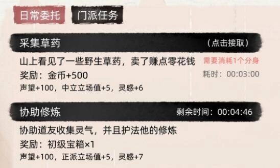 在确保只会开出正道功法后,就可以开始通过刷新任务领取奖励箱子(无论所属派别立场),也能用宗门贡献兑换箱子,持续这个过程直到把全身功法都替换成带有高额金钱加成的紫色、橙色功法。