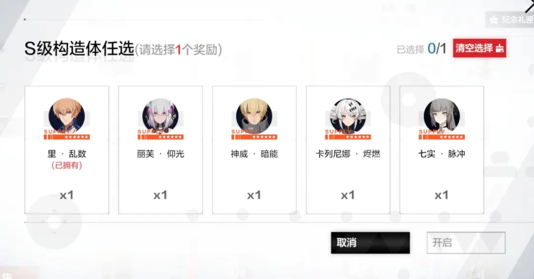 【新手S级自选包】(五款机体任选其一):这里无论选哪一款都不会影响大家入坑,选个自己喜欢的就行,也可以选丽芙·仰光作为辅助型机体使用~对后续的养成和战斗没有影响。