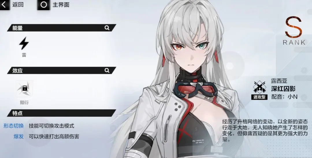 深红囚影是萌新手中相当强力的雷系主C,前期用来开荒推图堪称“好大哥”般的存在。而且战双有升阶机制,能通过获取碎片慢慢提升,所以不必担心2S的获取问题——只是这个过程会比较慢就是了。