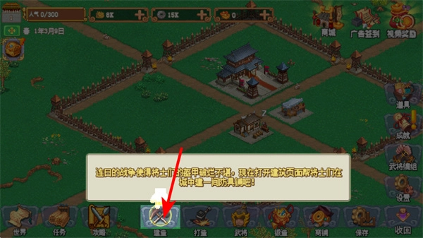 按照提示点击重置按钮,这是修复将士盔甲的操作步骤,点击之后能够让将士恢复状态,从而参与防守。