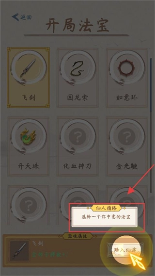 在法宝选择界面挑选你心仪的【飞剑】【困龙索】这类法宝,选定后点击踏入仙途,继续你的修仙之旅。