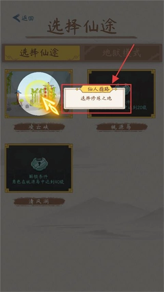 进入仙途选择界面后,可挑选【凌云峡】【桃源岛】这类修炼场所,接着依照提示逐步推进修仙的进程。
