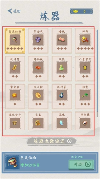 在炼器界面选择【巨灵仙酒】【紫金衣】这类道具,消耗元宝进行升级,以此提升战斗属性,助力修仙进程。