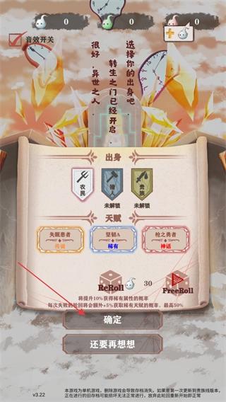 抽取天赋后,点击确定按钮,确认所选的农民出身与抽取到的天赋,以此进入后续的游戏进程。
