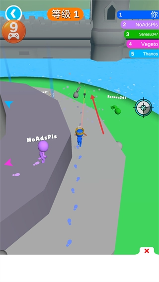 继续操控蓝色小人朝着红色箭头所指的对手方向移动,利用场景里的道具来完成攻击动作。