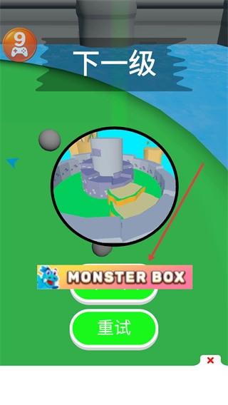 界面会弹出“下一级”的提示,点击红色箭头所指的区域,即可准备进入下一级关卡。