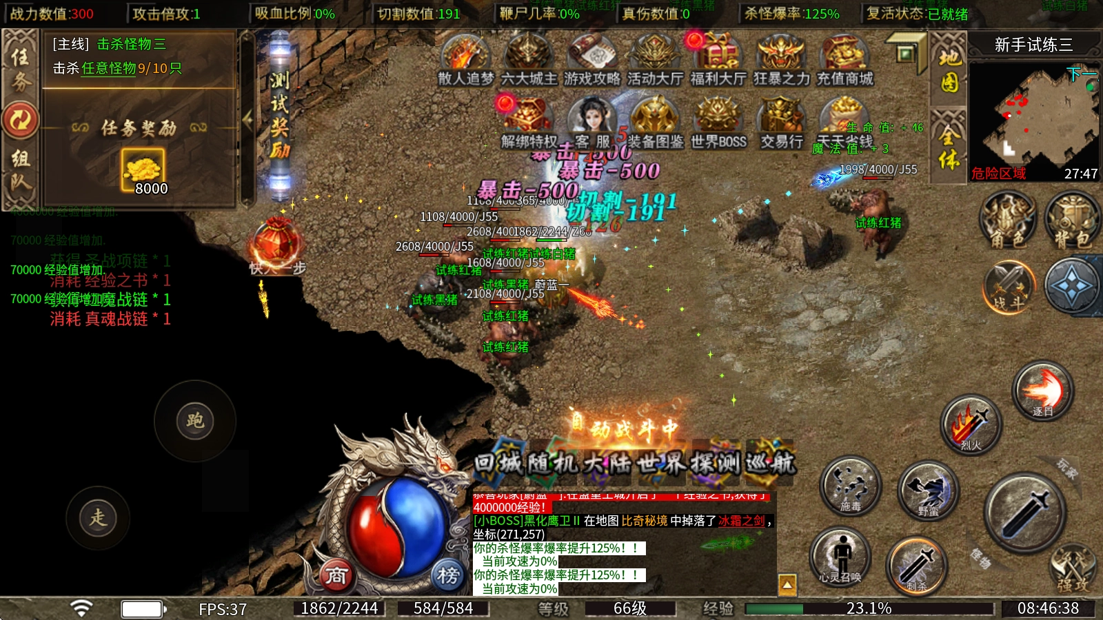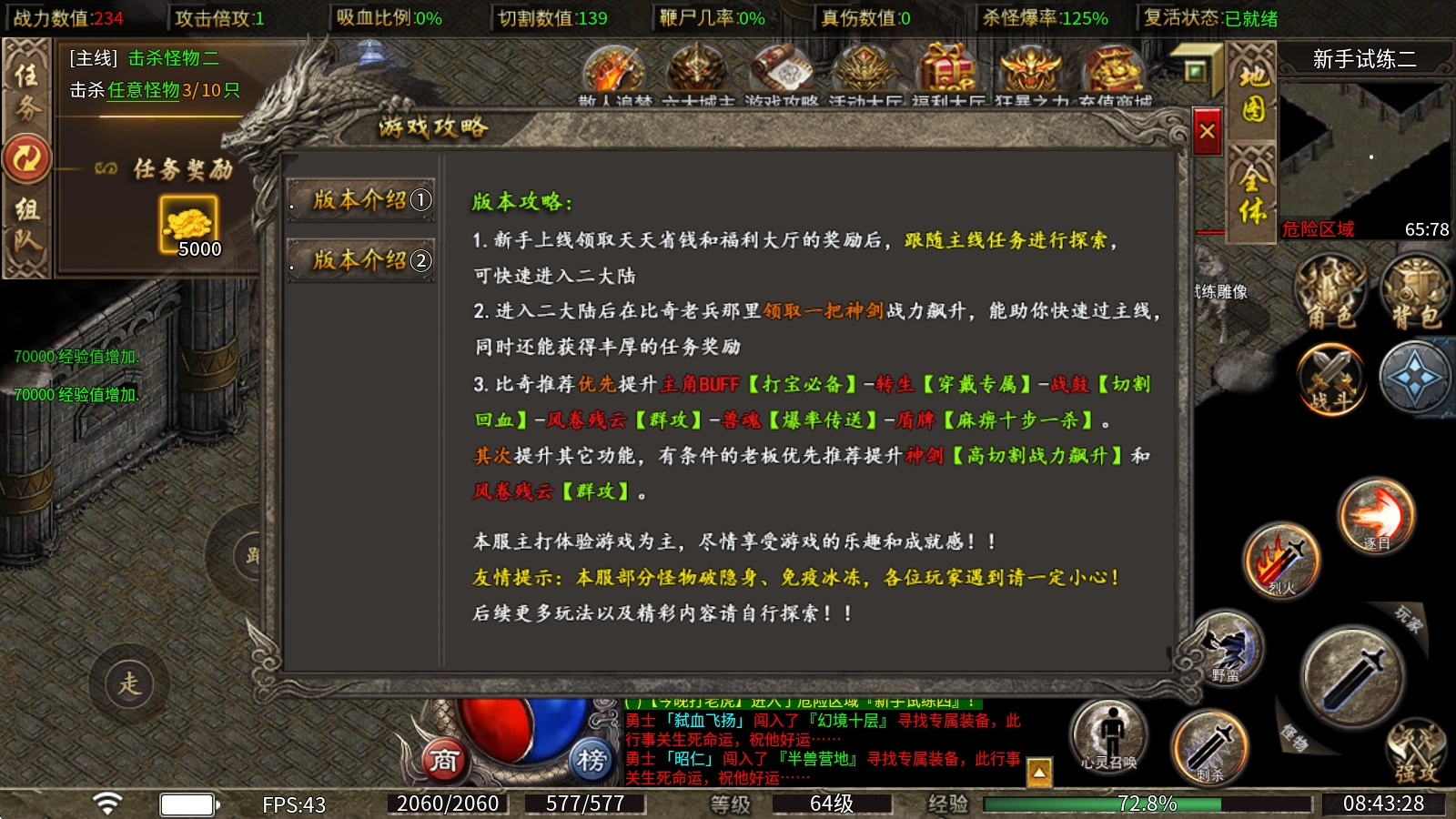 3、比奇这边建议优先提升主角的这些能力:BUFF是打宝必不可少的,转生要穿戴专属装备,战鼓能实现切割回血,风卷残云具备群攻效果,兽魂有爆率加成和传送功能,盾牌则带有麻痹和十步一杀的特性。