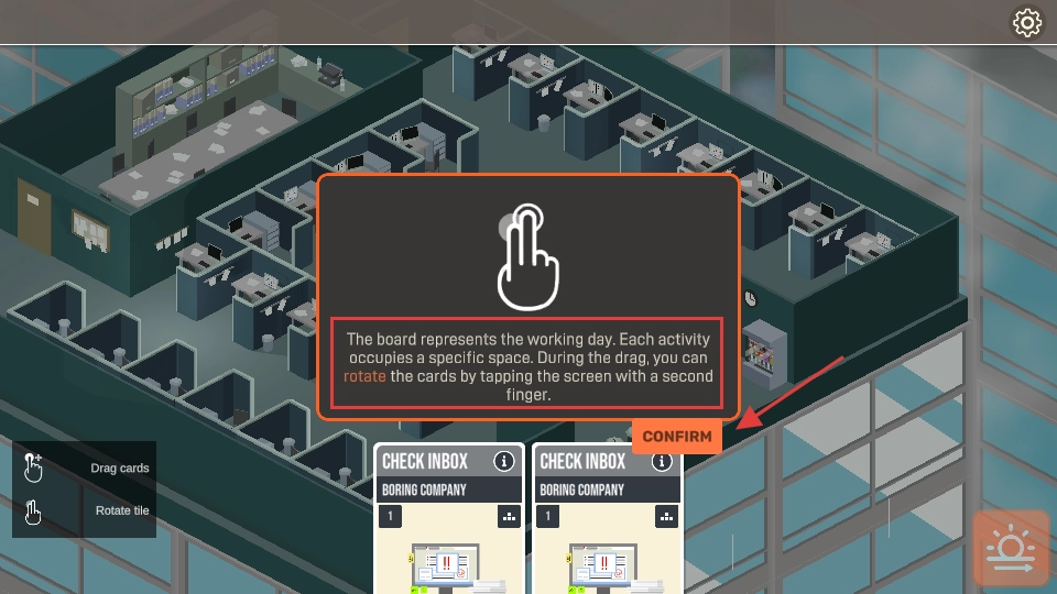 2、按照指引拖动【CHECKINBOX-BORINGCOMPANY】卡片,拖动过程中用二指点击能实现旋转操作,完成后点击【CONFIRM】即可。