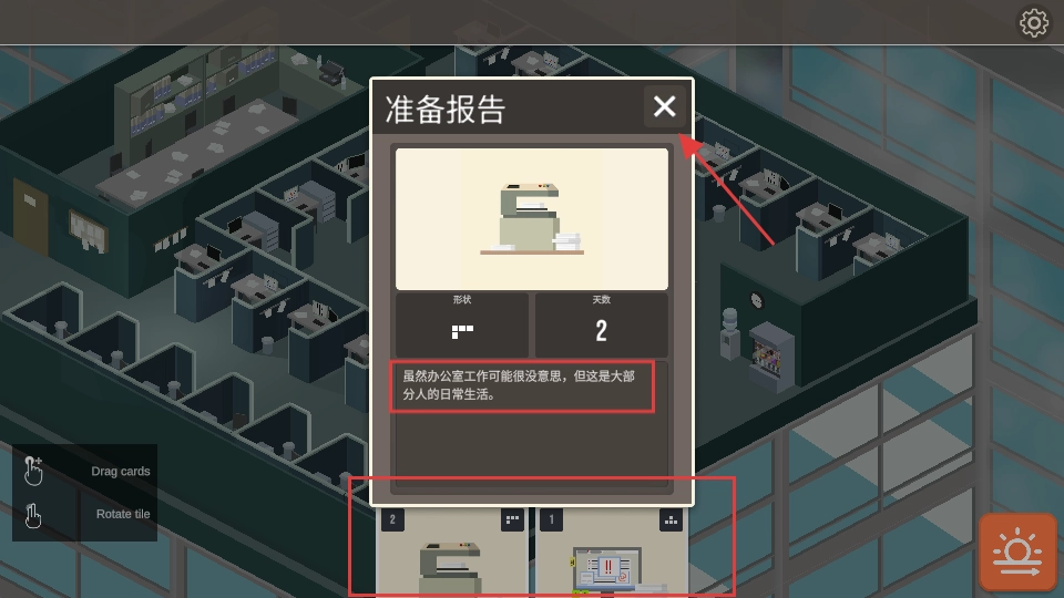 3、点击叉号关闭【准备报告】弹窗,拖动下方卡片至合适位置,再根据实际需求推进办公室工作流程。