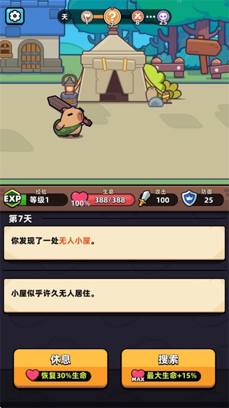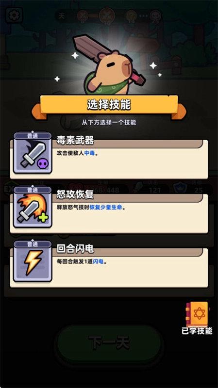 进入卡皮巴拉go最新版本游戏后,玩家会看到一只悠闲的卡皮巴拉,点击“下一天”即可触发事件。