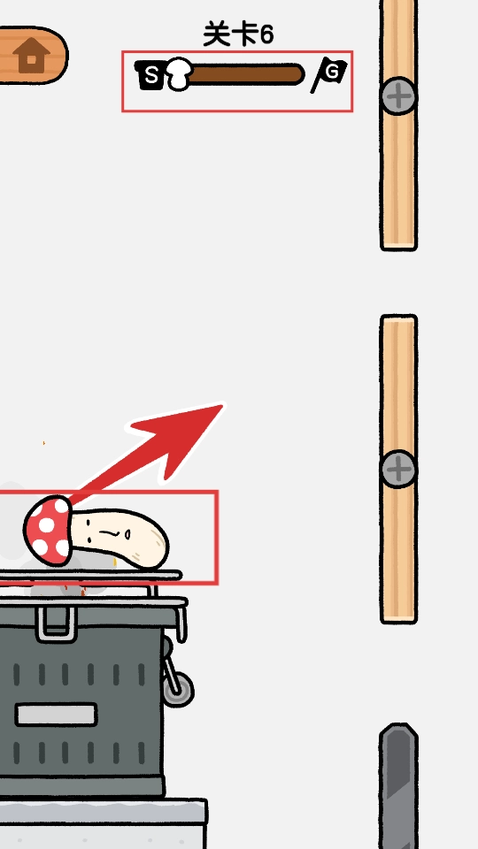 2、在【关卡6】里,控制蘑菇从【S】点启程,借助场景中的平台和木棍,朝着【G】点的方向移动,要留意滑动或者点击的节奏。