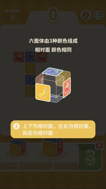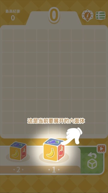 3、通过逐步点击放置六面体的六个面来展开它,将同色的面拼凑在一起以达成消除效果