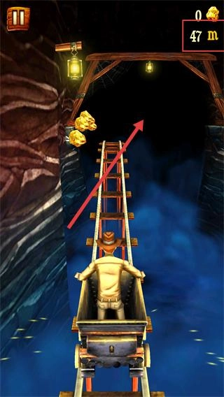 1、操控矿车沿轨道前进,留意轨道旁的【黄金道具】,靠近即可收集,同时记录行进距离(如【47-m】)。