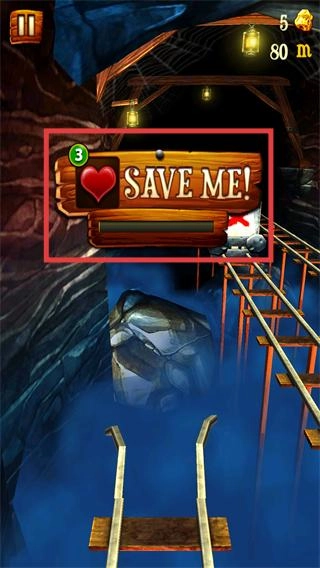 4、触发【SAVE-ME!】提示时,消耗【3】颗爱心道具,可复活矿车继续游戏,避免挑战失败。