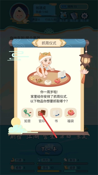3、当进行抓周仪式的时候可以选择对应的物品来影响成长的属性。