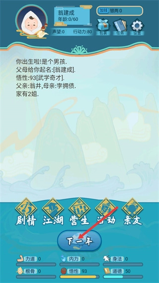武侠人生模拟器是一款以文字为主的模拟武侠修炼类,玩家将扮演初入江湖的的侠士并通过不同的际遇来遇到各种有缘的人生导师教导成为一名武侠,在探索的过程中也会遇到不同的武功和心法秘籍,通过修炼来练就一身的武功可以与敌人搏斗,也能不断的锻炼来升级自己的天赋和属性,游戏内也能创立或者进入门派来完成不同的任务去换取奖励,当门派的声望越大所获得的奖励也就越多。