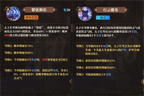 繁弦和乐:太子长琴攻击敌方全体,概率封印敌方目标的灵器技能与被动技能,升级增加封印基础概率,消耗30灵气;4级技能延长封印回合,5级技能概率吸收敌方灵气,是两个提升显著的技能等级。