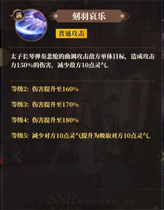 刻羽哀乐:攻击敌方单体,同时减少敌方10点灵气,升级提升伤害,5级技能减少敌方灵气提升为吸取敌方10点灵气,是显著提升的技能等级。
