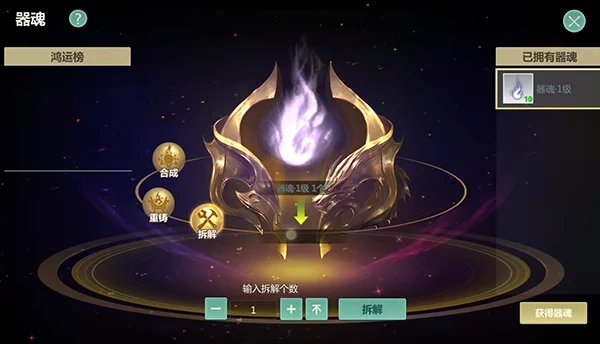 高等级器魂可拆分为两个次一级器魂,1级器魂无法进行拆解操作。