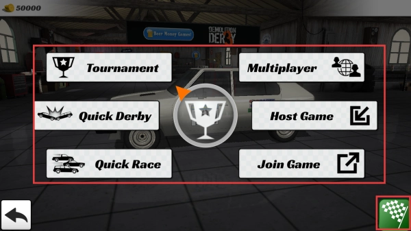 2、在赛事界面,可选【Tournament】、【QuickRace】等模式,选好后点【方格旗】进入比赛。