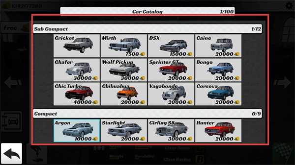 2、进入车辆目录界面后,可依据当前拥有的金币数量挑选合适的车型进行购买,通过解锁更多赛车来增强在比赛中的竞争力。