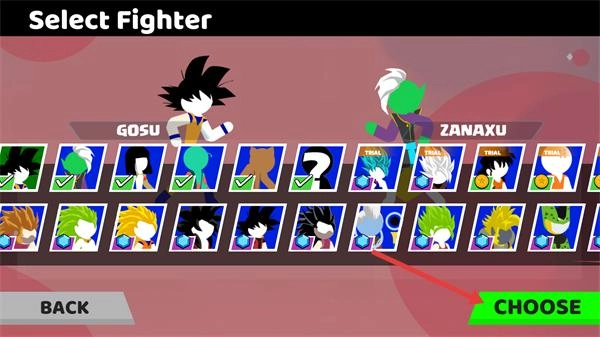 1、在【Select-Fighter】界面选择【GOSU】或【ZANAXU】角色,点击【CHOOSE】按钮确定所选格斗角色。