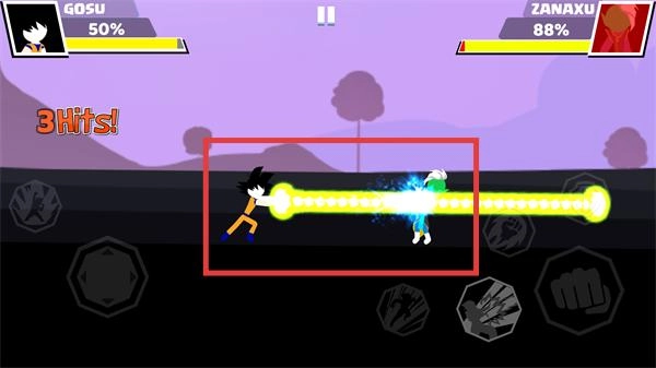2、操控【GOSU】释放技能以触发【3-Hits!】连击,在此状态下【GOSU】的血量为【50%】,并对【ZANAXU】造成伤害。