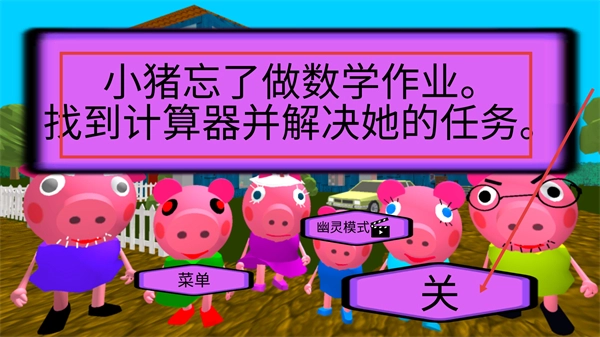 2、游戏弹出任务提示,需完成【找到计算器并解决小猪的数学作业任务】,点击【关】按钮处理提示弹窗。