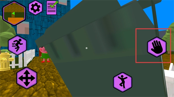 3、操控角色靠近垃圾桶时,界面出现【手掌】交互按钮,同时保留【奔跑】【方向移动】等基础操控按钮。