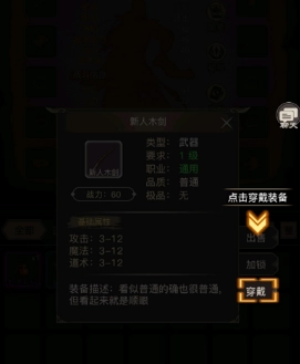 点击“穿戴”按钮就能装备武器,对于不需要的装备,也可以通过出售功能来处理。