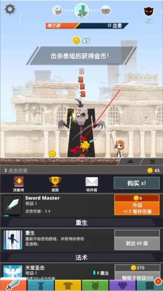 进入游戏后,玩家需在屏幕上进行点击操作,以此操控剑圣对泰坦发起攻击并造成伤害。每次攻击产生的伤害会削减泰坦的生命值,当泰坦的生命值降至零时,便会掉落金币。这些金币可用于对剑圣进行强化,点击屏幕下方的标签即可进入强化界面。此外,屏幕上方还会不时出现一些小任务,完成这些任务能够略微提升关卡推进的速度。