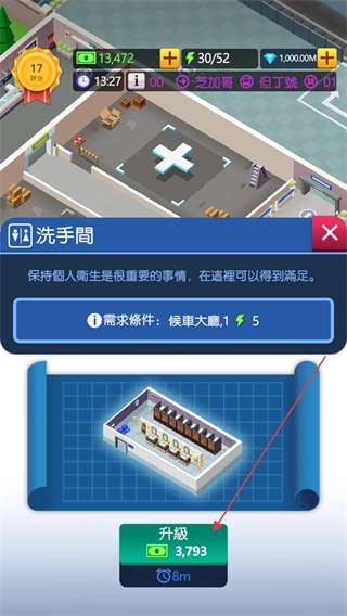 在车站房间地面的加号位置点击,即可建造新的洗手间,建造时需满足所需条件并消耗货币来完成搭建。
