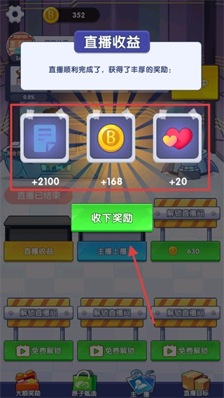 直播结束后点击【收下奖励】按钮,就能获得【2100】份文件、【168】枚金币和【20】颗爱心,这些资源可用于后续的升级操作。
