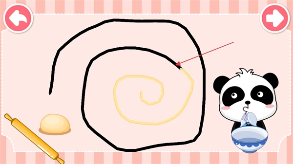 在下面的画面里,你可以点击面团并拉出一条拉面,把它放进熊猫宝宝的碗中,喂饱熊猫宝宝。